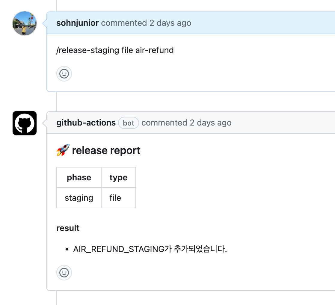 release ๋ผ๋ comment ๋ฅผ ๋จ๊ธฐ๋ฉด workflow ๊ฐ ํด๋น PR ์ ๋๊ธ๋ก ์๋ตํด์ฃผ๋ workflow ๋ฅผ ์์ฑํฉ๋๋ค.