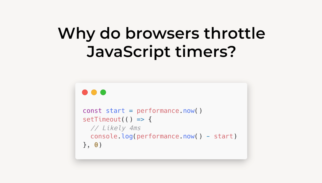 μ Microsoft Edge νμ μμμ λ, λΈλΌμ°μ κ° μ΄λ° λ°©μμ μ±νν μ΄μ λ "λ¨μ©"μ λ°©μ§νκΈ° μν¨μ΄λΌκ³ λ€μμ΅λλ€. μ¦, setTimeoutμ κ³Όλνκ² μ¬μ©νλ μΉμ¬μ΄νΈκ° λ§κΈ° λλ¬Έμ, μ¬μ©μμ λ°°ν°λ¦¬ μλͺ¨λ₯Ό λ§κ³ μνΈμμ©μ μ°¨λ¨νμ§ μκΈ° μν΄ λΈλΌμ°μ κ° 4msλΌλ νΉλ³ν "μ νλ" μ΅μ μκ°κ°μ μ€μ νλ€λ κ²μ΄μμ΅λλ€.